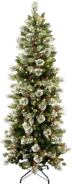 7.5′ Slim Pre-Lit Tree with Pine Cones, Red Berries, and White Lights